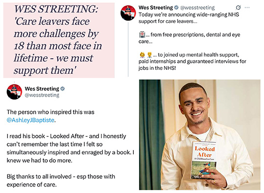Ashley's first book, Looked After: A Childhood in Care (published by Hodder & Stoughton), was nominated for The Hatchards 2024 Best First Biography Prize and was the inspiration for the government extending free NHS services for care leavers, as announced by Wes Streeting on 23rd December 2025.